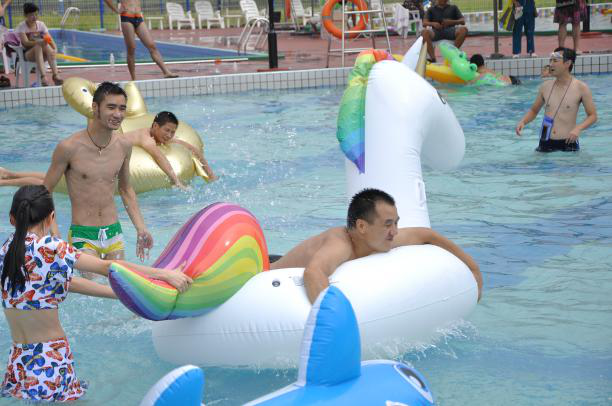隨后,水上趣味接力賽拉開了帷幕。選手們趴在造型各異的動物氣墊上從水上滑梯沖入水中,濺起陣陣浪花,然后奮力將氣墊劃向下一個選手處。把氣墊當成小船往前劃非常費力,選手們嘗試了各種方法,有用手劃水的,有用腳蹬的,還有手腳并用的,有的還一不小心掉進了水里,水池邊的圍觀啦啦隊們又一次忍俊不禁的開懷大笑。