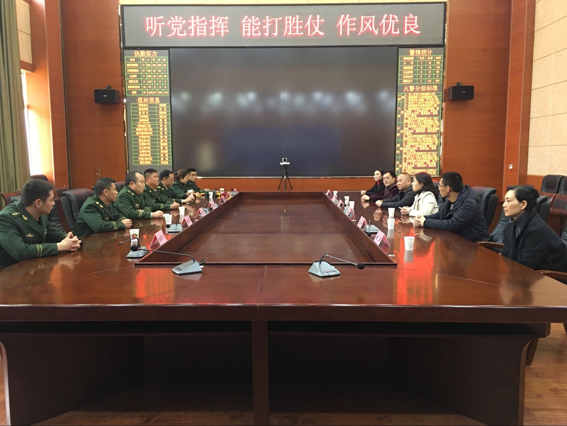 隨后,消防支隊(duì)政委胡長(zhǎng)友、黨委委員、防火處長(zhǎng)歐堪奎、司令部副參謀長(zhǎng)文俊和消防官兵代表與陳筱秋總經(jīng)理一行進(jìn)行了親切的座談。陳總感謝道:春節(jié)前夕,二水廠因取水困難停產(chǎn),造成江北片區(qū)大面積停水,在春節(jié)消防任務(wù)重的情況下,官兵們及時(shí)伸出援助之手,為停水區(qū)域進(jìn)行了送水,對(duì)此我們深表感謝。停水片區(qū)的醫(yī)院儲(chǔ)水量告急,古塔路中隊(duì)得到消息后,迅速組織消防車輛將30噸水送到了醫(yī)院,保障了重點(diǎn)單位的用水需求。家住七樓行動(dòng)不便的獨(dú)居老人打來(lái)電話求助,消防官兵們?cè)陉?duì)里找來(lái)礦泉水桶裝滿水,扛到七樓送到老人家里。在停水期間,這樣的感人事跡還有很多。